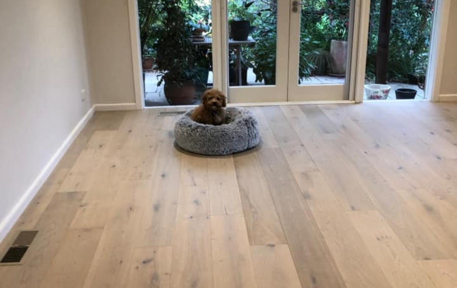 Happy customers with their recently installed European Oak ‘Sonora’ 190x14/3mm. Timber comes with puppy approval