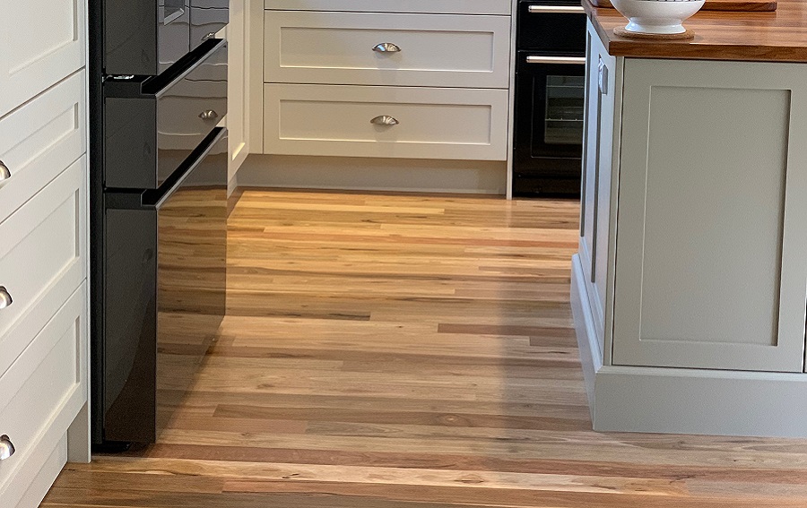 A customer’s favourite, NSW Spotted Gum with a light and natural water base finish. Compliments this farmhouse style kitchen.